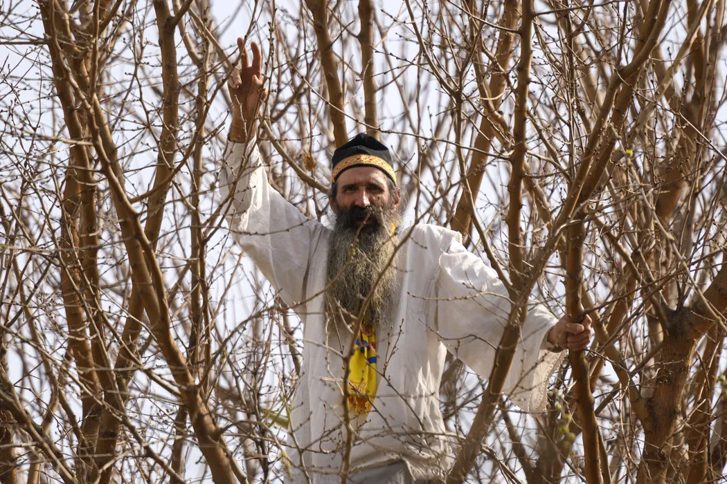 Protestatarul Cezar Avramuta, cunoscut ca “stegarul dac”, sta intr-un copac din curtea Arestului Central al Capitalei (Serviciul Independent de Reinere si Arestare Preventiv), in semn de protest fata de decizia de retinere pentru 30 de zile a lui Bogdan Peschir, acuzat de mita electorala in favoarea fostului candidat la prezidentiale Calin Georgescu, in Bucuresti, luni, 24 martie 2025. ALEXANDRU DOBRE / MEDIAFAX FOTO.