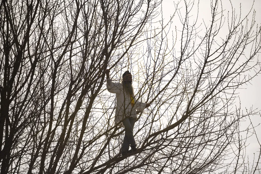 Protestatarul Cezar Avramuta, cunoscut ca “stegarul dac”, sta intr-un copac din curtea Arestului Central al Capitalei (Serviciul Independent de Reinere si Arestare Preventiv), in semn de protest fata de decizia de retinere pentru 30 de zile a lui Bogdan Peschir, acuzat de mita electorala in favoarea fostului candidat la prezidentiale Calin Georgescu, in Bucuresti, luni, 24 martie 2025. ALEXANDRU DOBRE / MEDIAFAX FOTO.