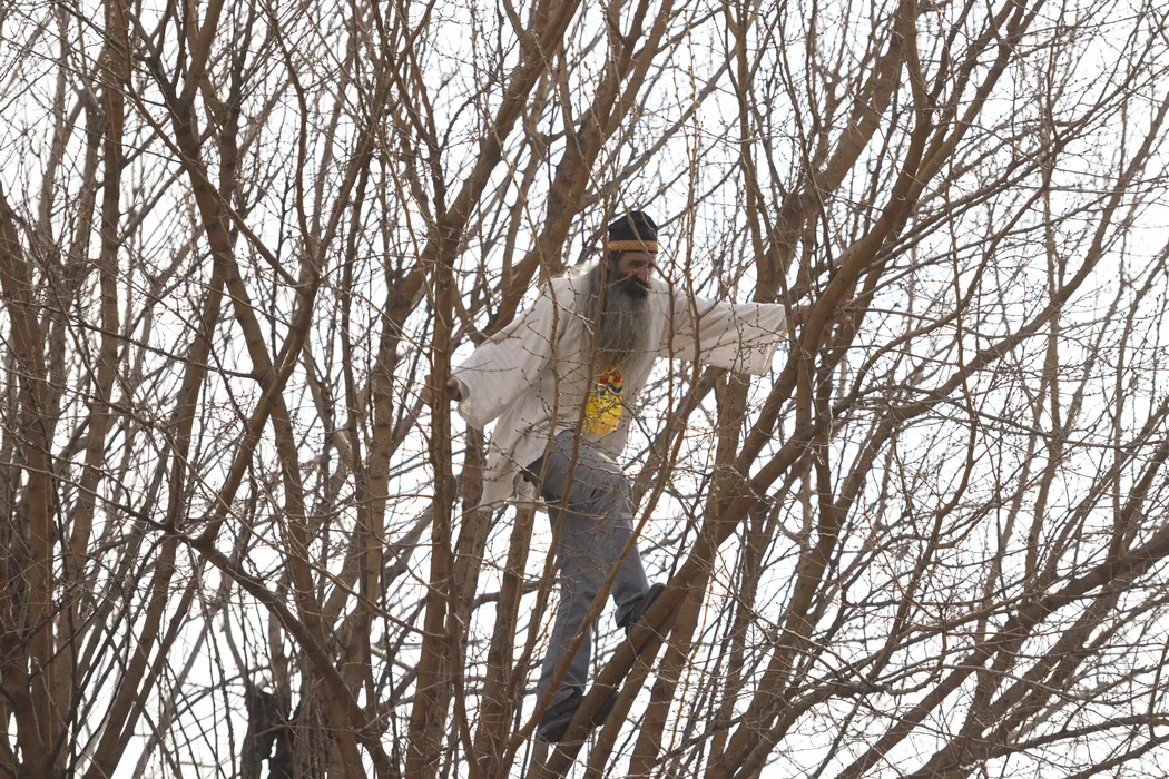 GALERIE FOTO: „STEGARUL dac” Cătălin Avrămuță s-a urcat într-un copac din fața Arestului Central, unde se află Bogdan Peșchir. Cere eliberarea lui BogPR
