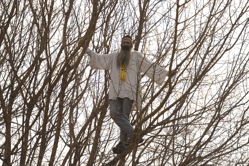 Protestatarul Cezar Avramuta, cunoscut ca “stegarul dac”, sta intr-un copac din curtea Arestului Central al Capitalei (Serviciul Independent de Reinere si Arestare Preventiv), in semn de protest fata de decizia de retinere pentru 30 de zile a lui Bogdan Peschir, acuzat de mita electorala in favoarea fostului candidat la prezidentiale Calin Georgescu, in Bucuresti, luni, 24 martie 2025. ALEXANDRU DOBRE / MEDIAFAX FOTO.