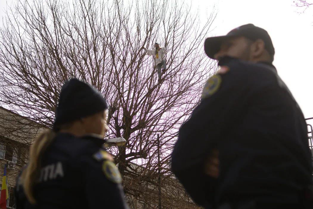 GALERIE FOTO: „STEGARUL dac” Cătălin Avrămuță s-a urcat într-un copac din fața Arestului Central, unde se află Bogdan Peșchir. Cere eliberarea lui BogPR