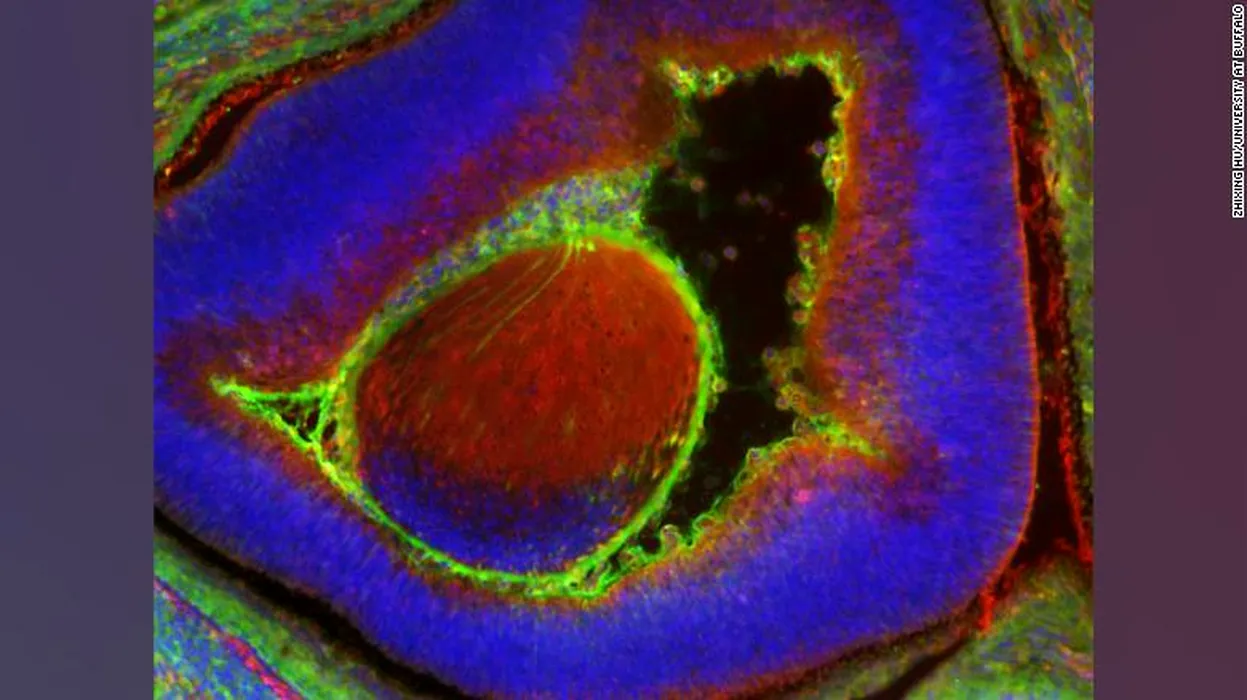 Celule umane sunt marcate cu verde și au devenit celule oculare în embrionul de șoarece, marcat cu albastru, în vârstă de 17 zile. De obicei, celulele oculare se generează într-un embrion uman mult mai târziu / Sursă FOTO: Zhixing Hu via CNN