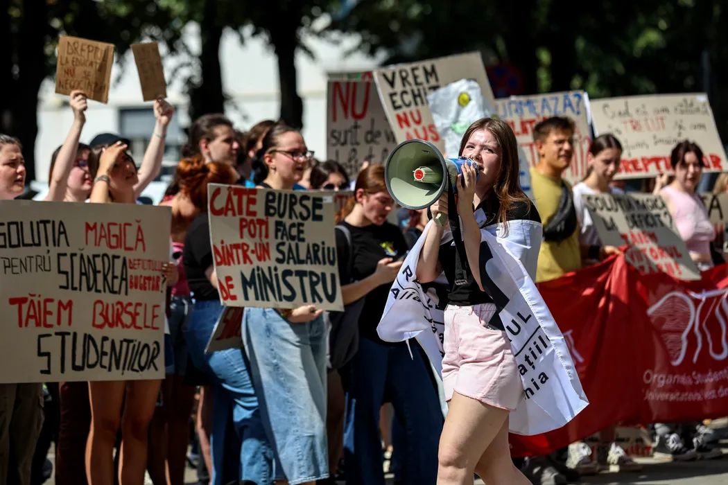 Mai multi studenti protesteaza în fata Prefecturii Timis impotriva planurilor noului guvern de a reduce fondurile pentru bursele studentesti, joi, 26 iunie 2025, in Timisoara. DANI AMARIEI / MEDIAFAX FOTO