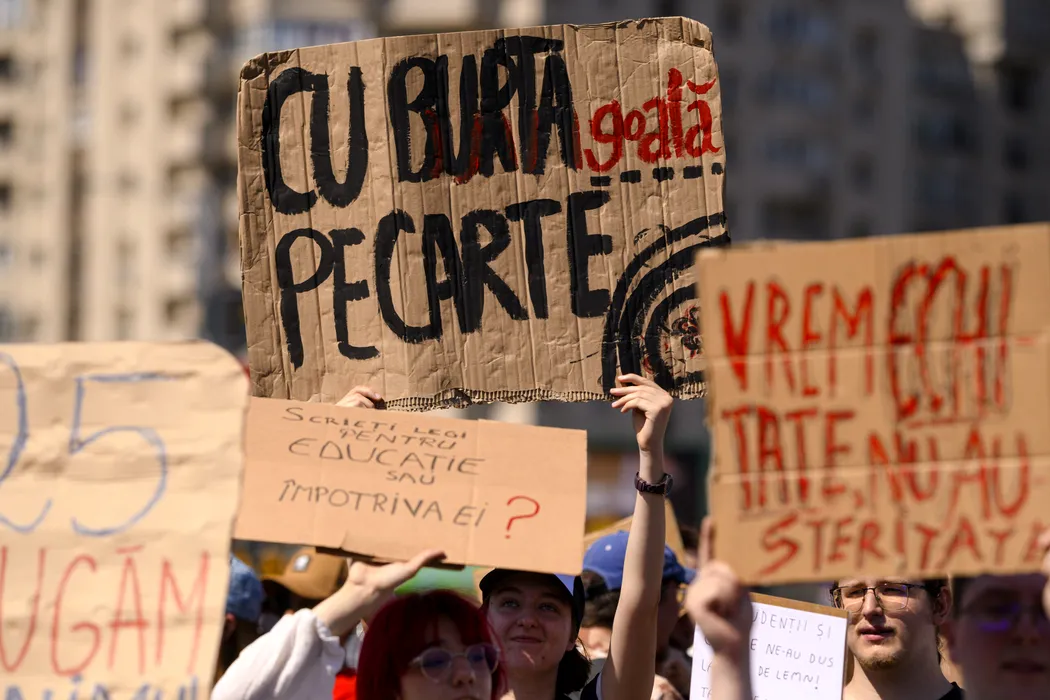 O tanara afiseaza o pancarta pe care scrie: "Cu burta goala pe carte" in timpul unui protest organizat de Alianta Nationala a Organizatiilor Studentesti din Romania (ANOSR) impotriva reducerii fondurilor pentru burse, in fata Guvernului, in Piata Victoriei din Bucuresti, joi, 26 iunie 2025. ALEXANDRU DOBRE / MEDIAFAX FOTO.