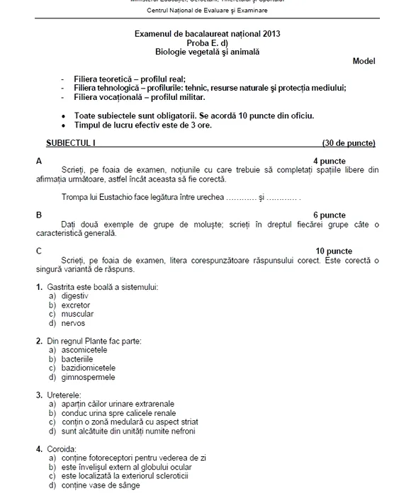 SUBIECTE BAC 2013 BIOLOGIE. Modele de subiecte pentru BIOLOGIE la BAC 2013