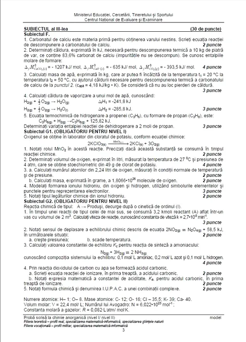 SUBIECTE BAC 2013 CHIMIE. Elevii au putut alege proba de CHIMIE ANORGANICĂ la BAC 2013