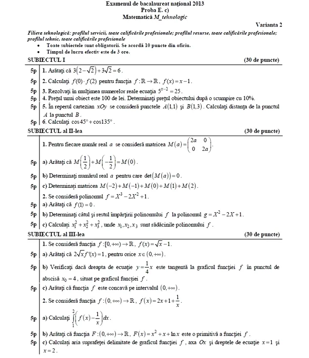SUBIECTE BAC 2013 MATEMATICĂ. Problemele primite de elevii de la TEHNOLOGIC. „Un Fleac”, pentru elevii care le-au rezolvat