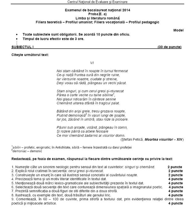SUBIECTE BAC 2014. Modele de subiecte pentru BACALAUREAT 2014, română, publicate pe edu.ro