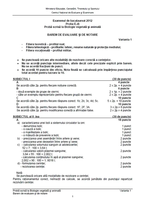 SUBIECTE ȘI BAREM BAC 2012 BIOLOGIE