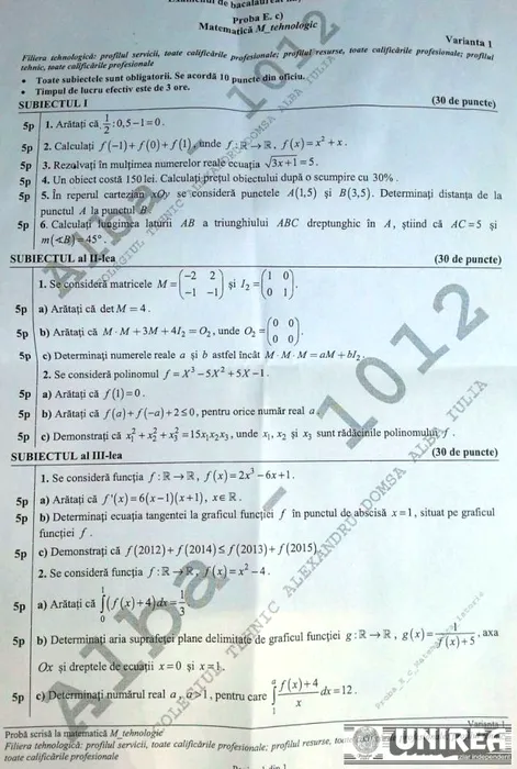 Subiecte și barem Bacalaureat 2015 matematică, pe Edu.ro. Subiecte la profilurile mate-info, științele naturii și tehnologic date la sesiunea de toamnă