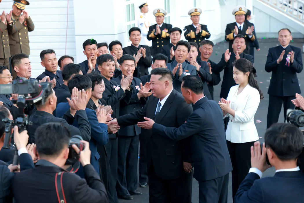 HANDOUT - 26 April 2025, North Korea, Nampho: A photo released by the North Korean State News Agency (KCNA) on 26 April 2025 shows North Korea's leader Kim Jong-un being greeted by workers at a launching ceremony for a new navy destroyer at a shipyard in the western port city of Nampho. Photo: -/kcna/dpa - ATTENTION: editorial use only and only if the credit mentioned above is referenced in full