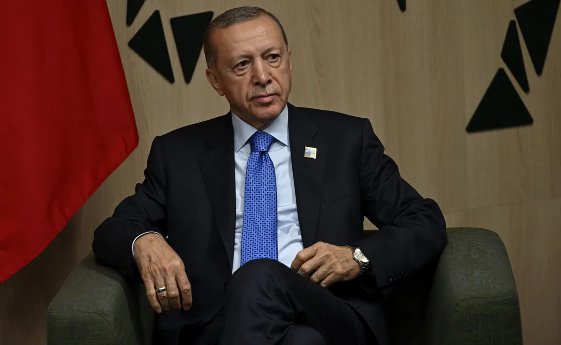 Turkey's President Recep Tayyip Erdogan is pictured during a bilateral meeting with Britain's Prime Minister on the sidelines of a NATO Summit in Vilnius, Lithuania, Tuesday July 11, 2023. (Paul Ellis/Pool Photo via AP)