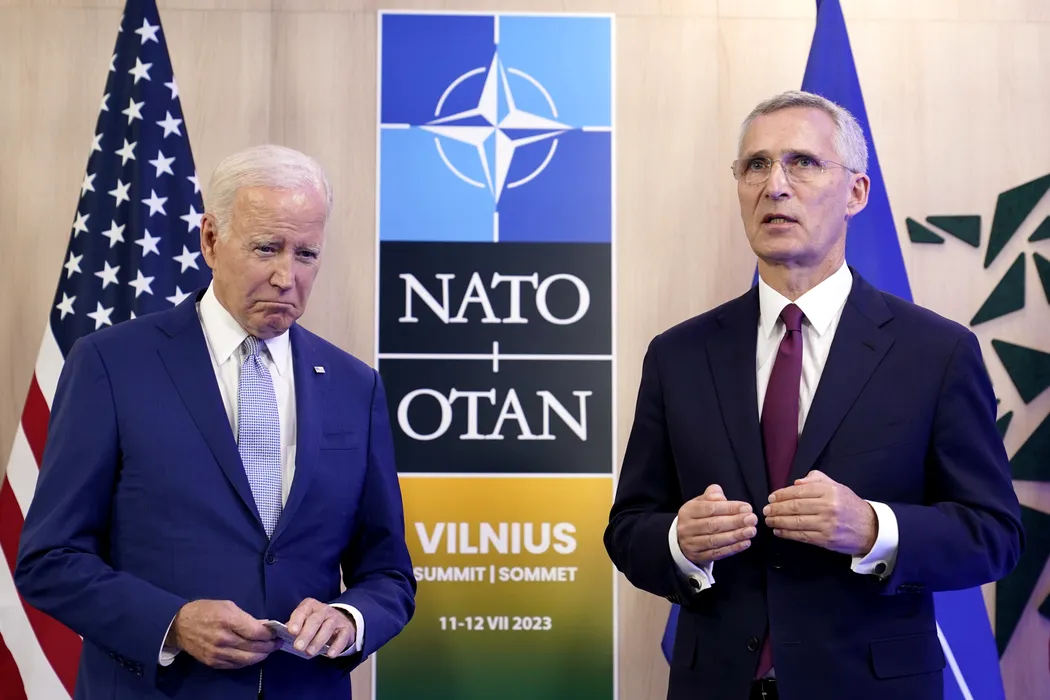 U.S. President Joe Biden, left, and NATO Secretary General Jens Stoltenberg give remarks at the NATO summit in Vilnius, Lithuania, Tuesday, July 11, 2023. Russia's war on Ukraine will top the agenda when NATO leaders meet in the Lithuanian capital Vilnius on Tuesday and Wednesday. (AP Photo/Susan Walsh)