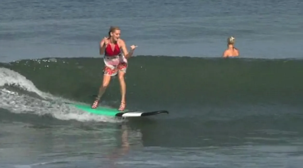 Surfing cu tocuri în picioare. Rusoaicele fac spectacol pe valurile din Bali. VIDEO