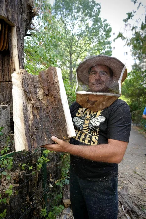 GALERIE FOTO: Sute de albine trăiau în interiorul unui copac din Sectorul 3 și au fost salvate de Patrula Apicolă Urbană