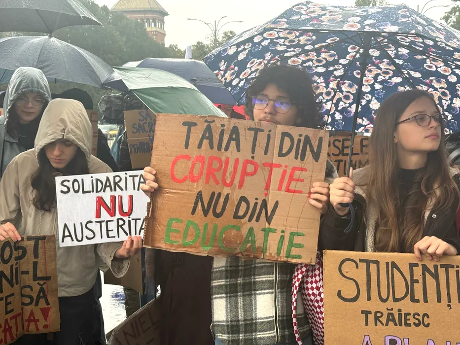 Sute de studenți protestează în ploaie, în Piața Victoriei, față de măsurile Guvernului Bolojan