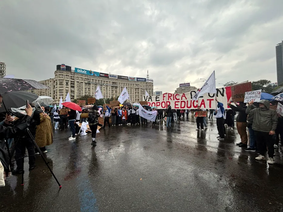 Sute de studenți protestează în ploaie, în Piața Victoriei, față de măsurile Guvernului Bolojan