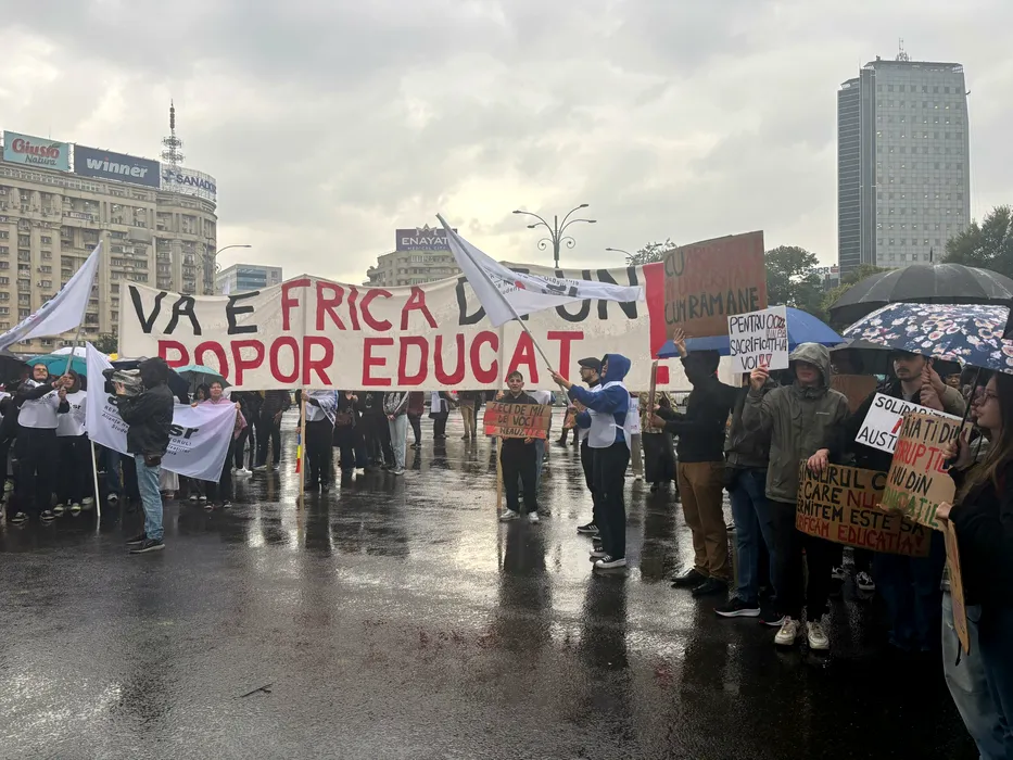 Sute de studenți protestează în ploaie, în Piața Victoriei, față de măsurile Guvernului Bolojan