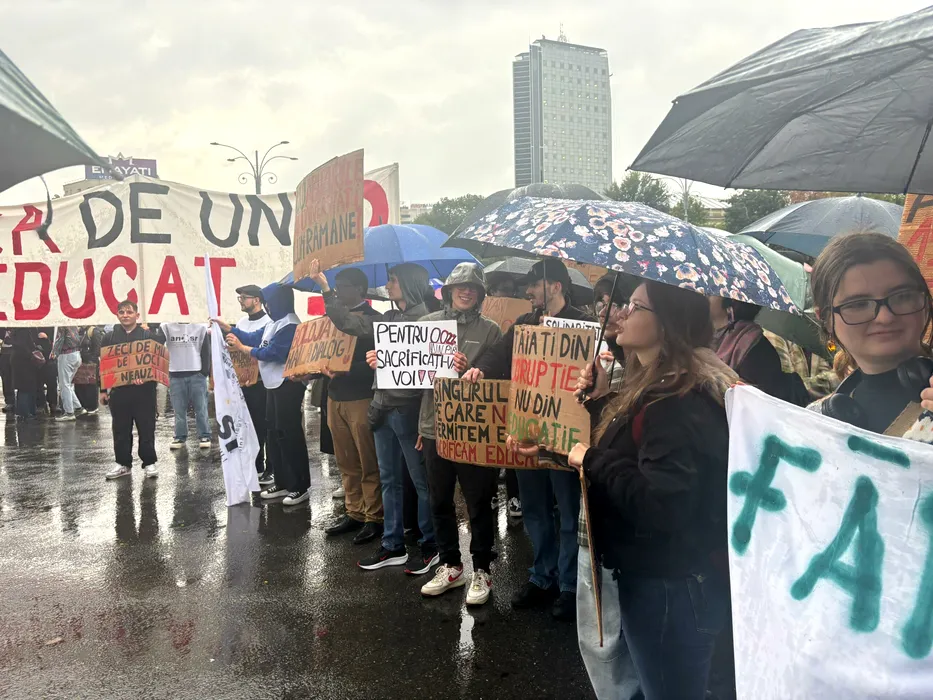 Sute de studenți protestează în ploaie, în Piața Victoriei, față de măsurile Guvernului Bolojan