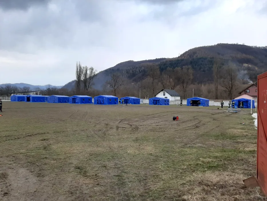 FOTO-VIDEO | Tabără mobilă montată pe stadionul din Siret, în care vor fi putea fi cazați temporar refugiați din Ucraina. Sunt disponibile 30 de corturi