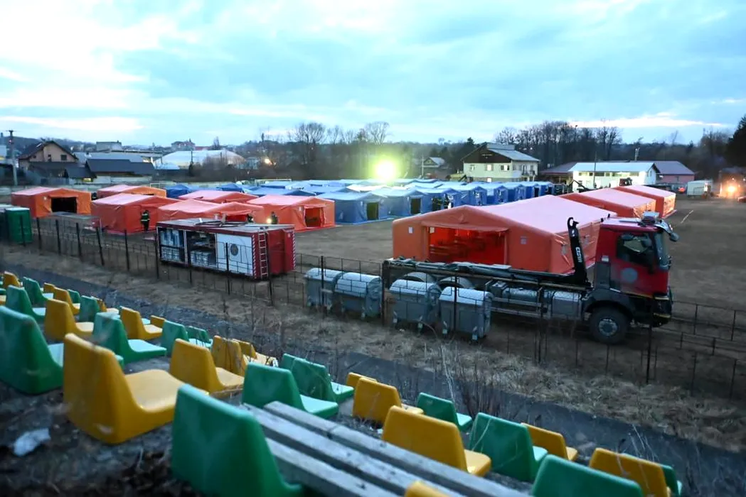 FOTO-VIDEO | Tabără mobilă montată pe stadionul din Siret, în care vor fi putea fi cazați temporar refugiați din Ucraina. Sunt disponibile 30 de corturi