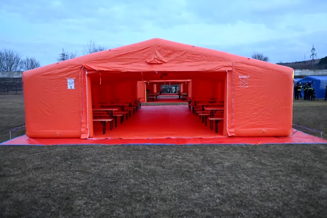 FOTO-VIDEO | Tabără mobilă montată pe stadionul din Siret, în care vor fi putea fi cazați temporar refugiați din Ucraina. Sunt disponibile 30 de corturi