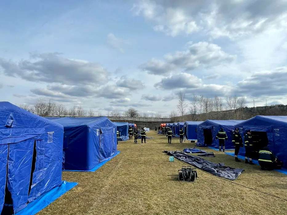 FOTO-VIDEO | Tabără mobilă montată pe stadionul din Siret, în care vor fi putea fi cazați temporar refugiați din Ucraina. Sunt disponibile 30 de corturi