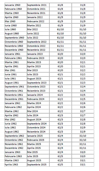 Tabel cu vârste standard de pensionare și stagii complete de cotizare pentru Femei (6)