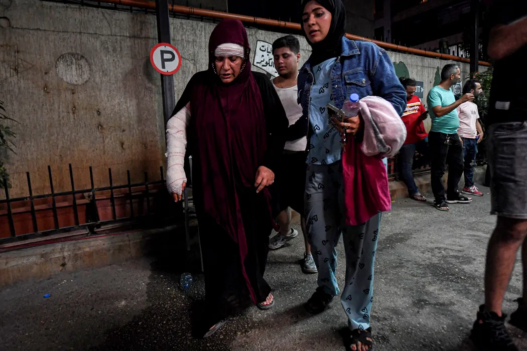 A woman injured in an Israeli military strike on a building in Beirut's southern suburb on July 30, 2024, is escorted as she leaves the Bahman hospital. The Israeli military said it carried out a strike on July 30, in Beirut that targeted a Hezbollah commander responsible for the killing of children in last week's rocket attack on the Golan Heights. A source close to Hezbollah told that a senior commander was targeted in an Israeli strike on its south Beirut stronghold.,Image: 894264202, License: Rights-managed, Restrictions: , Model Release: no
