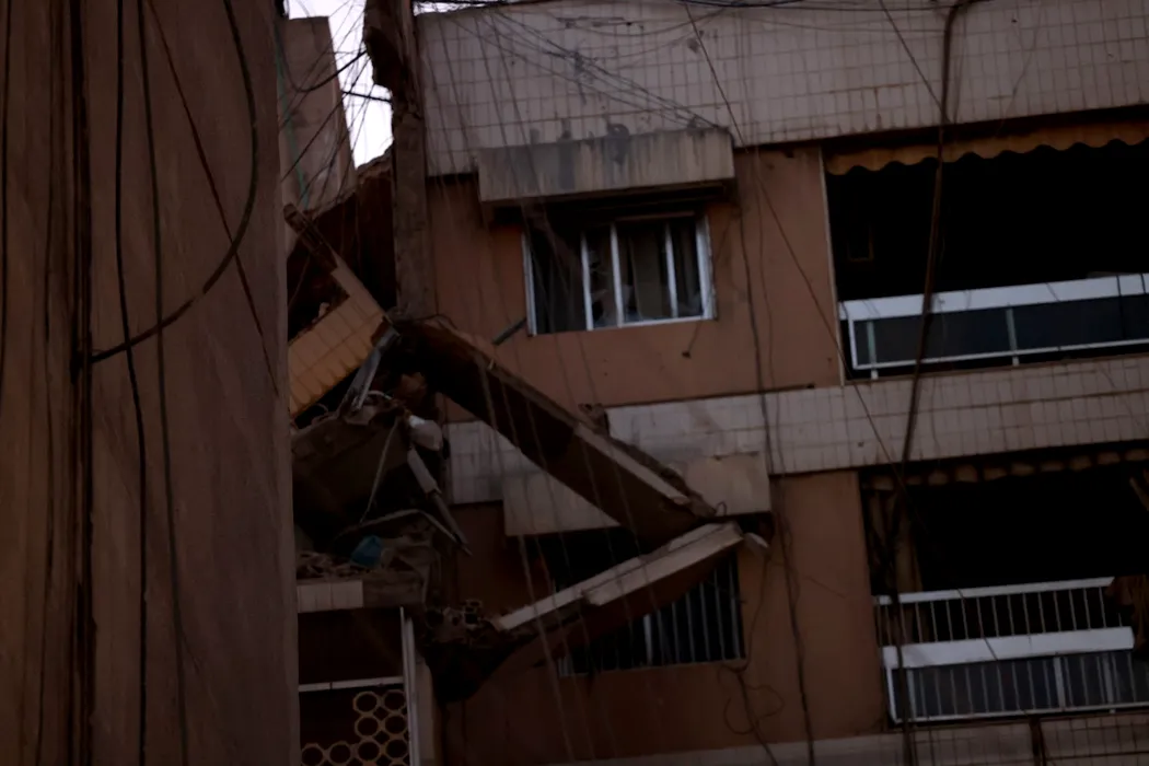 An photo taken on July 30, 2024, shows the destroyed top floors of an eight storey building following an Israeli military strike on Beirut's southern suburb. The Israeli military said it carried out a strike on July 30, in Beirut that targeted a commander responsible for the killing of children in last week's rocket attack on the Golan Heights. A source close to Hezbollah told AFP that a senior commander was targeted in an Israeli strike on its south Beirut stronghold.,Image: 894239307, License: Rights-managed, Restrictions: , Model Release: no