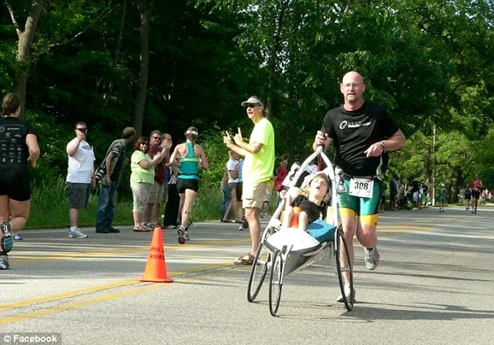 Tatăl secolului, la triatlon cu fiica paralizată în brațe: „Ea e inima mea, iar eu țin locul picioarelor ei”