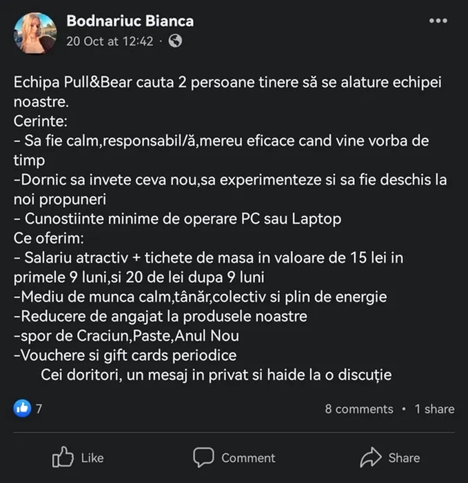 Iulian din Iași a găsit pe Facebook un anunț de angajare la Pull&Bear. A plătit 450 de lei „taxă de training”, dar ce a urmat depășește orice imaginație / Sursa foto: BZI