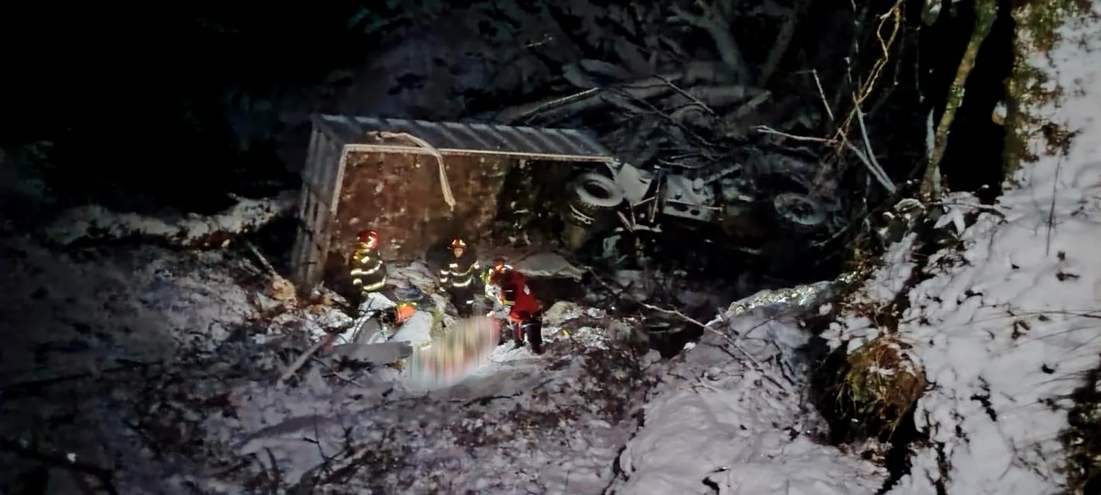 Tragedie pe Valea Arpașu Mare. Doi bărbați au murit după ce un camion cu lemne s-a prăbușit în râpă de 170 de metri