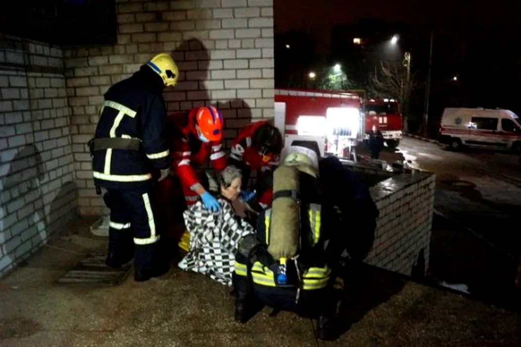 Rescuers and medics evacuate a patient after a fire at a regional hospital for infectious diseases in Zaporizhzhia, Ukraine, in this handout picture released February 4, 2021. State Emergency Service Of Ukraine in Zaporizhzhia region/Handout via REUTERS
