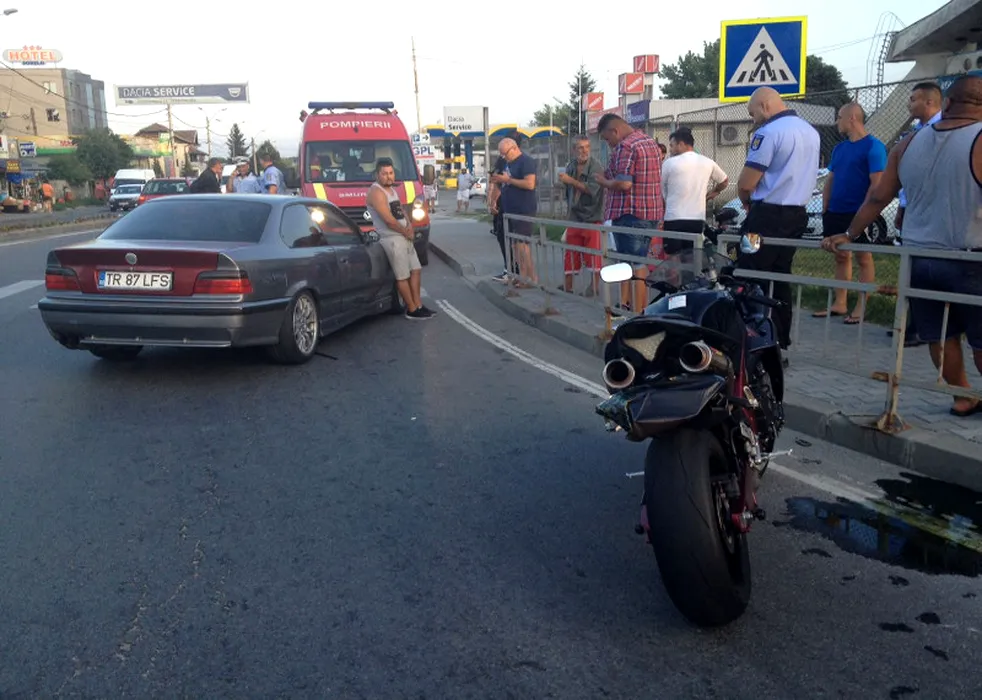 Trei romi cu un BMW au șicanat un motociclist la intrarea în Pitești. Coșmarul lor a început după ce l-au dărâmat și au coborât la el înarmați. VIDEO