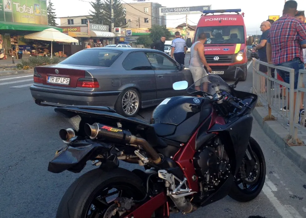 Trei romi cu un BMW au șicanat un motociclist la intrarea în Pitești. Coșmarul lor a început după ce l-au dărâmat și au coborât la el înarmați. VIDEO