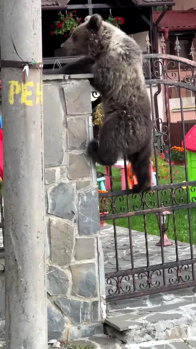 FOTO-VIDEO – Imagini incredibile surprinse la Bușteni. Trei urși se cațără pe gardul metalic al unei case