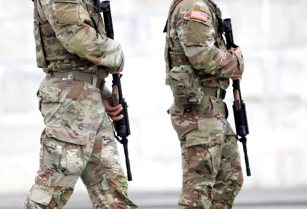 August 28, 2025, Washington Dc, Virginia, USA: Armed members of the National Guard patrol at the base of the Washington Monument on the National Mall on August 28, 2025, in Washington, DC, USA. US President Donald Trump announced on August 25 new measures tightening his grip on security in Washington, ordering Defence Secretary Pete Hegseth to set up a specialised unit within Washington's National Guard for public order, and ending cashless bail. (Credit Image: © Gent Shkullaku/ZUMA Press Wire)