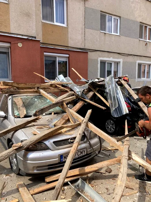 FOTO-VIDEO | Un acoperiș smuls de vânt a căzut peste mai multe mașini, într-o localitate din Alba. Județul se află sub cod portocaliu de instabilitate atmosferică