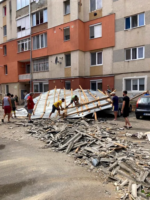 FOTO-VIDEO | Un acoperiș smuls de vânt a căzut peste mai multe mașini, într-o localitate din Alba. Județul se află sub cod portocaliu de instabilitate atmosferică
