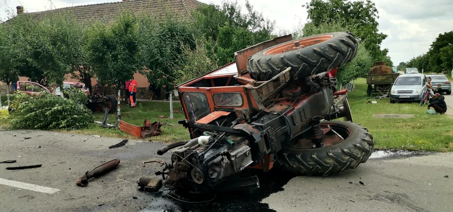Un adolescent din Arad care conducea un tractor a lovit o mașină și a ucis două persoane | Imagini șocante de la fața locului