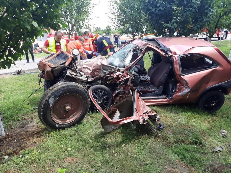 Un adolescent din Arad care conducea un tractor a lovit o mașină și a ucis două persoane | Imagini șocante de la fața locului