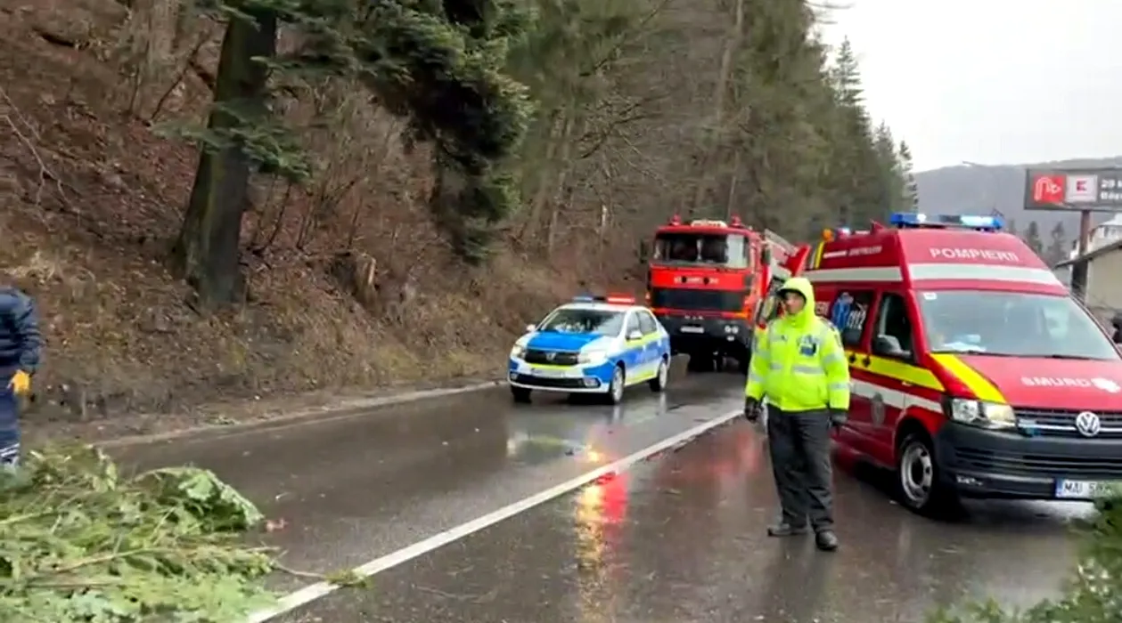 FOTO | Un arbore s-a PRĂBUȘIT peste o mașină, în județul Prahova. Două persoane au fost rănite