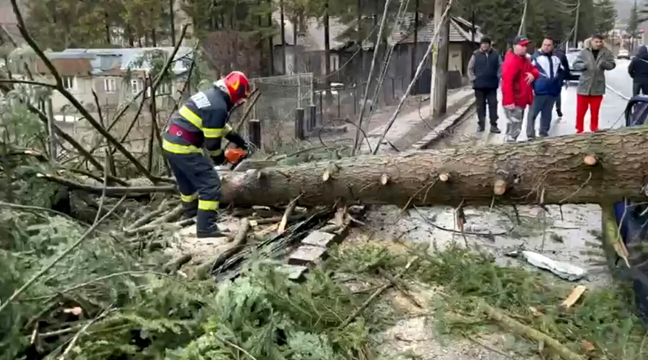 FOTO | Un arbore s-a PRĂBUȘIT peste o mașină, în județul Prahova. Două persoane au fost rănite