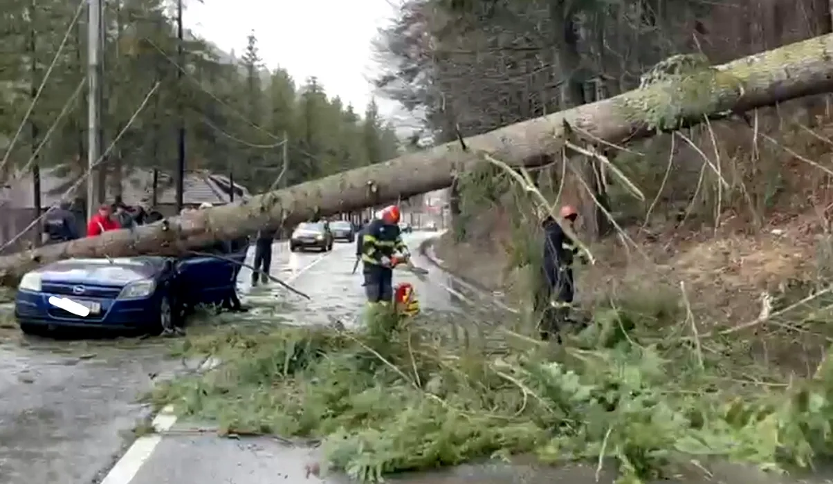 FOTO | Un arbore s-a PRĂBUȘIT peste o mașină, în județul Prahova. Două persoane au fost rănite