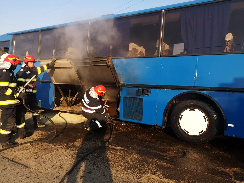 Un autocar cu 21 de copii la bord a luat foc, pe un drum din județul Botoșani (FOTO)