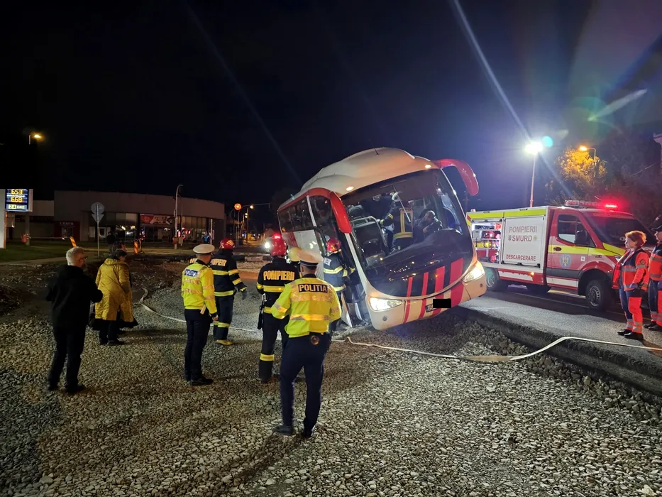 Un autocar cu 55 de pasageri la bord a DERAPAT, în zona gării din Alba-Iulia. Pompierii au acționat de urgență la locul accidentului