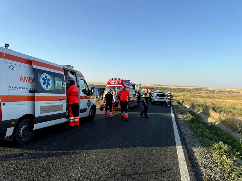 Un autocar cu 61 de ucraineni s-a RĂSTURNAT pe DN22. Două persoane au fost duse la spital
