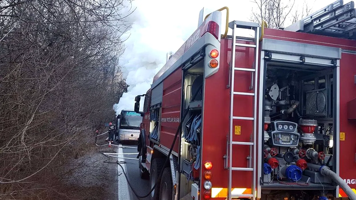 Un autocar în care se aflau 17 persoane a luat foc pe un drum din Caraș-Severin