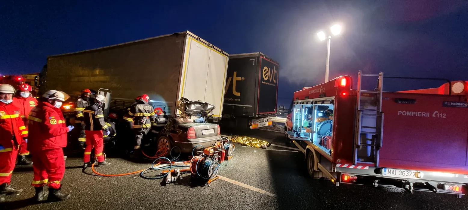 FOTO-VIDEO | Un autoturism a intrat sub un TIR, pe A1 la Vama Nădlac. Accidentul s-a soldat cu trei morți și un rănit